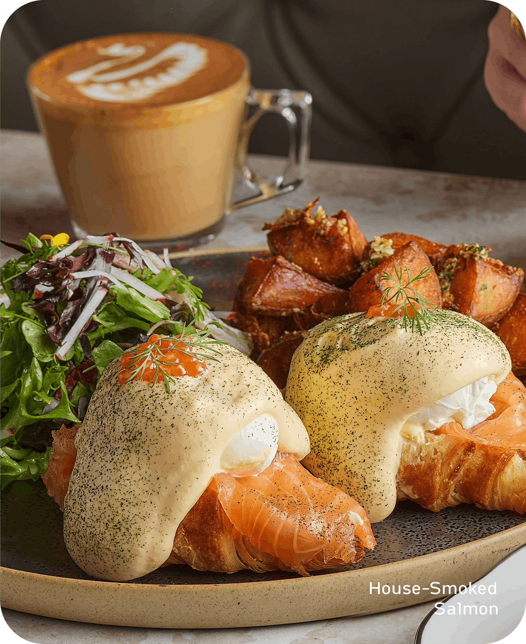 Croissant, herb cream cheese, ikura, dill, Nature’s farm poached eggs, hollandaise